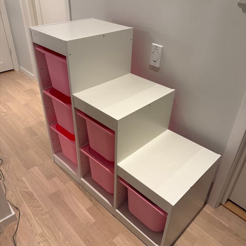 Ny hylle med kurver, kjøpt ny i oktober. Er kun brukt til babyleker som nå har blitt i lekekasse.