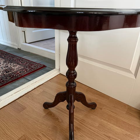 Vakkert åttekantet sidebord i klassisk stil, med rikt dekorert bordplate og slanke, buede ben. Bordet har praktisk oppbevaringsrom under lokket, trukket med grønt stoff – perfekt til småting, håndarbeid, blader eller annet du vil ha skjult.