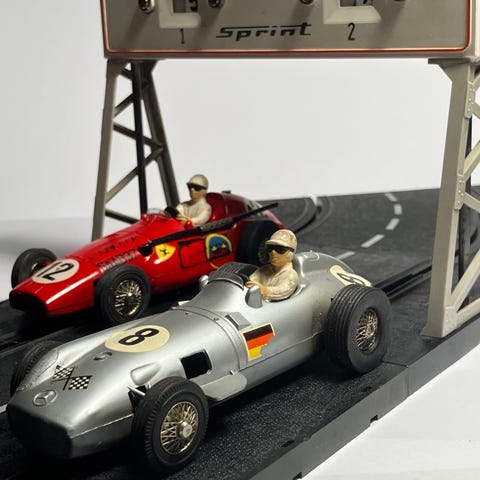 Har ikke vært brukt siden 1975, men er i bra tilstand. Alle deler er i esken, unntatt ett klips som skal holde bakketoppen oppe. (Kan bruke støtteben som følger med) Har testet bilene og det er 3 som fungerer, men trenger service og vedlikehold. .Følger med én bil til, men den trenger rep. evt. skifte motor. Rundeteller , omformer og ekstra skinner som vises på bildet, følger med..