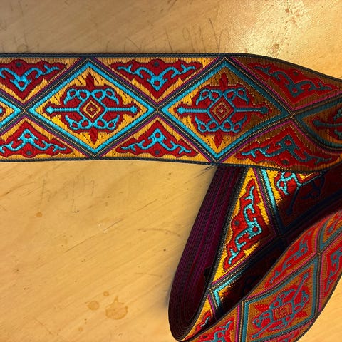 Tekstilbånd med mønster i blått og grønt. Båndet er 3 cm bredt og 4,10 m langt