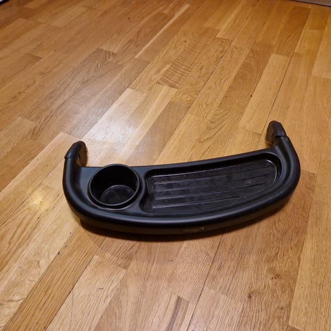 Baby Jogger barnevognsbrett med integrert koppholder i svart plastmateriale. Passer som tilbehør for å gi ekstra oppbevaringsplass og funksjonalitet til barnevogner.