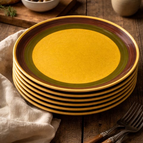 Selger komplett / delvis Figgjo Pompeii servise – det ikoniske 70-tallsdesignet med rustikk, håndmalt uttrykk og jordnære farger som minner om antikkens Pompeii.