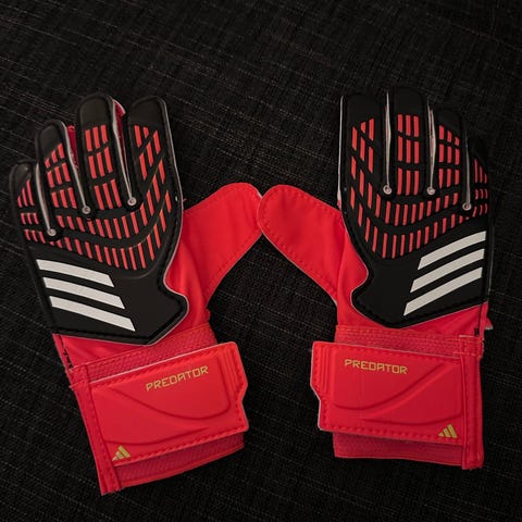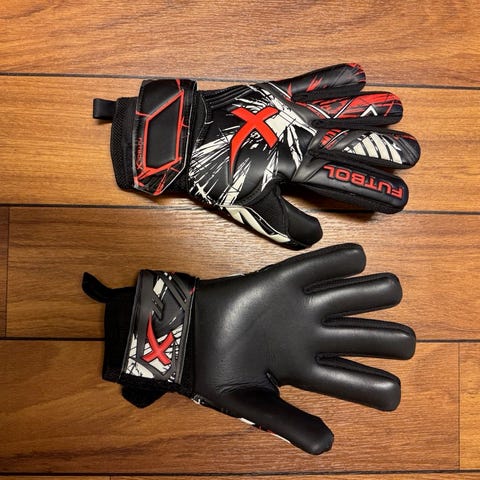 Hanskene har svart og hvit farge med oransje detaljer. Egnet for bruk av målvakter i fotball.