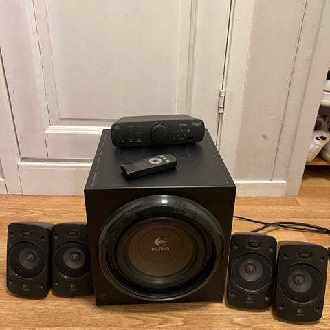 Logitech Surroundlydssystem høyttalere, THX lyd, med flere enheter inkludert subwoofer og kontrollenhet. Systemet leveres med kabler og 2 veggfester og digital lydutgang (optisk) kabel. Har dessverre ikke kontroll. Men kan få med en logitech harmoni touch(se bilde).