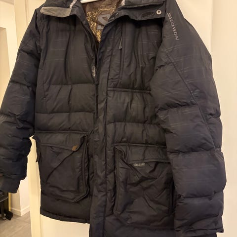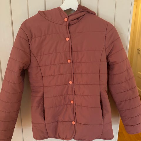 Fin dunjakke som er lite brukt i str. M. Den er ikkje falmet selv om det ser slik ut på bilde. Hetten kan tas av. Kr 200+porto