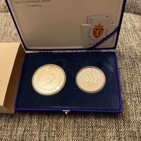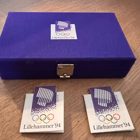 Selger komplett sett med offisielle norske OL-minnemynter fra Lillehammer 1994, utgitt av Den Kongelige Mynt, Kongsberg.