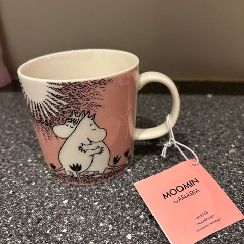 Arabia Mummi kopp med blå og hvit farge. Tror den heter lett snøfall. Koppens design inkluderer motiver fra Mummitrollet. Egnet for daglig bruk som drikkekopp.