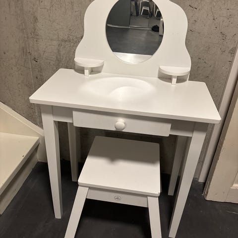 Svært pent og lite brukt. Det var et par små neglelakkflekker på bordet som er fjernet med neglelakkfjerner. En liten flekk med neglelakk på krakken som ikke er fjernet. Ellers uten anmerkninger.