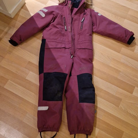 Pent brukt dress fra Didriksons str 130 i rosa. Bruksmerker finnes, noe slitasje på knær, men dressen er hel og pen. Seler innvendig.