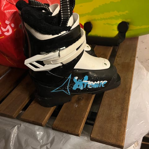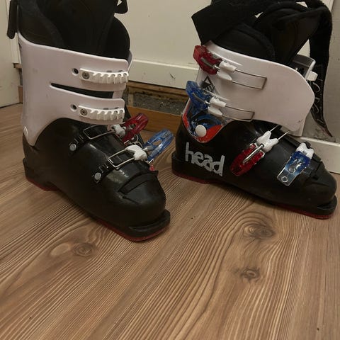 Head alpinstøvler med svart og hvit farge og røde spenner. Støvlene har justerbare spenner for tilpasning.