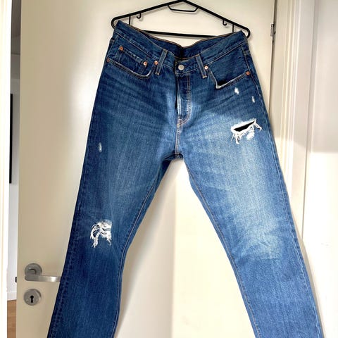 Levi's 501 jeans i blå farge laget av bomull. Størrelse 32x31, litt små i størrelsen. Klassisk modell i denimstoff, egnet for kvinner.