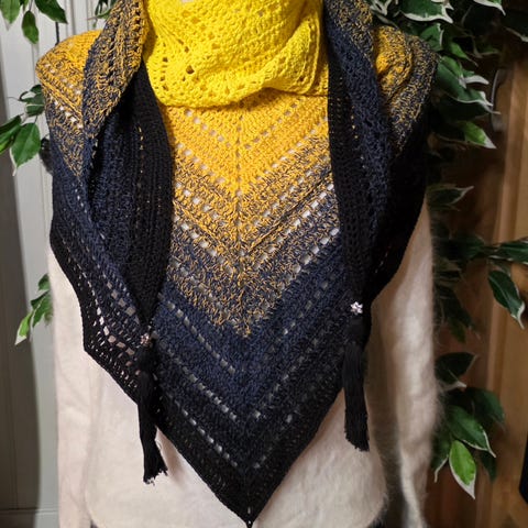 Heklet sjal, heklet av meg i et flott fargeskiftene garn. Sultan Shadow er laget av 100% ren, myk bomull med en unik konstruksjon av 4 uspunnede tråder. Garnet er designet med flotte, lange fargeforløp som skifter glidende fra den ene nyansen til den andre. Overgangen skjer gradvis, en tråd av gangen, noe som skaper en flott gradient.