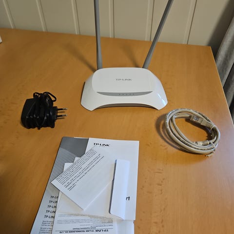 TP-Link Archer C20 Router med flere Ethernet-porter og USB-tilkobling. Enheten har to antenner for trådløs nettverksdekning og leveres med strømadapter.