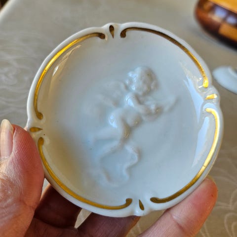 Capodimonte porselen M.A.S pynteskrin med lokk. Skrinet har en dekorativ relieff med figurer og detaljer i gullfarge. Produktet er laget av ekte italiensk porselen og kommer fra Italia. Lekker vase fra samme sted. Det er fra ca 1950 og svært dekorativt. Det er helt strøkent, samleobjekt. Vakkert. Kan selges hver for seg til 900,- pr stk eller begge til 1600,-.