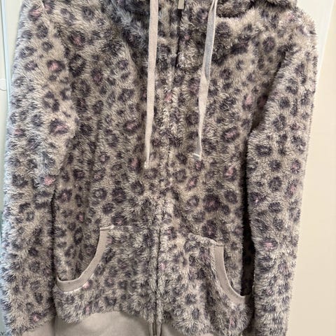 Leopard hettegenser med glidelås ned til lommen som er i midten av genseren.