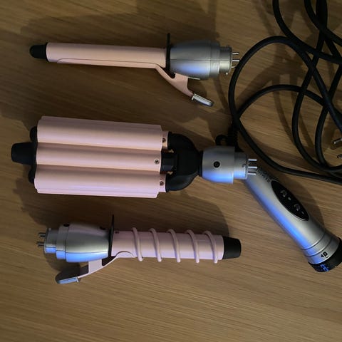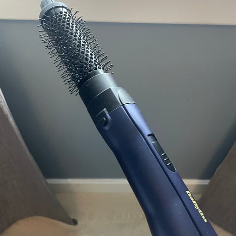 BaByliss PRO rundbørste med blå børstehode. Elektrisk hårstylingverktøy med ledning, egnet for å style og forme hår.
