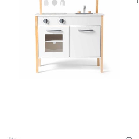 IKEA lekekjøkken i hvitt med blå og hvite stripete gardiner. Lekekjøkkenet har kokeplater, vask med kran og ovn. Krittavle på baksiden. Laget i tremateriale.