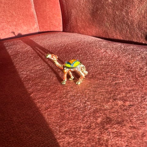 Sjarmerende kamelfigur i keramikk/lergods med gul glasur og håndmalte detaljer. Har et tydelig vintage preg og fin patina som gir karakter.