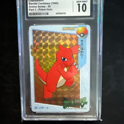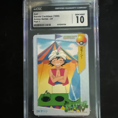 Bandai Carddass 1996 Ash and Brock Pokémon samlekort. Kortet er innkapslet og vurdert til tilstanden GEM MINT 10 av CGC. Kortet viser Ash og Brock fra Pokémon-serien.