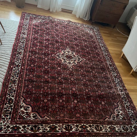 Håndknyttet Kashmir silkteppe selges. Takstrapport på 22.000nok i 2022. Har vært i vårt eie siden 2023. Det finnes et par steder der teppet er litt slitt, se bildene.