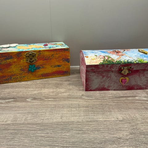 To oppbevaringsbokser med håndtak, laget i lyst tre. Settet består av to separate bokser i forskjellige størrelser med skillevegger i boksene. Egnet for organisering og oppbevaring av små gjenstander. Den største er 25 x 43 x 7 cm. Den mindre 25 x 21,5 x 7cm. Tunge og massive. Selges samlet 250,-
