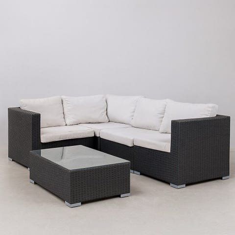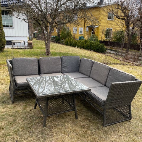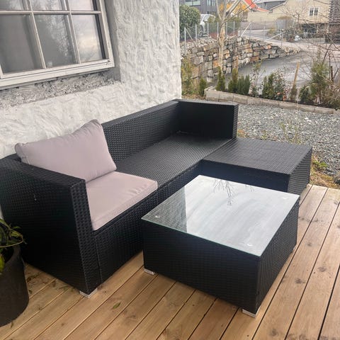 Hjørnesofa sett i svart kunstrotting med grå puter. Settet inkluderer en hjørnesofa, en stol og et bord med glassplate. Passer for utendørs bruk. Stol mangler en ryggepute og har skader i armlene .
