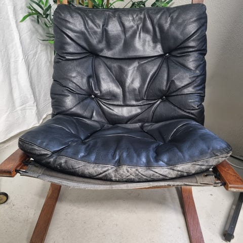 Kul «siesta» skinnstol. Må fixes i nakkepute / hempe har røket, og ene siden av sittepute, hempe røket