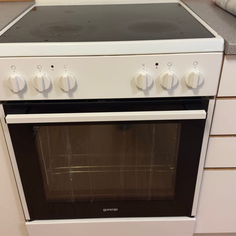 Gram keramisk komfyr med keramisk koketopp. Komfyren har ovnsrom med stekefunksjon og flere betjeningsknapper for kontroll av varme og funksjoner. Følger med en vanlig rist, en vanlig stekebrett og et dypt stekebrett.