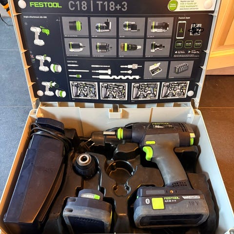 Festool 12 V m/1stk 3 Ah batteri, 1 stk 1.2 Ah batteri, eksenterchuck, vinkelchuck, vanlig chuck, liten hurtigkobling for bits og lader. Magnetholder for løse bits på håndtak.