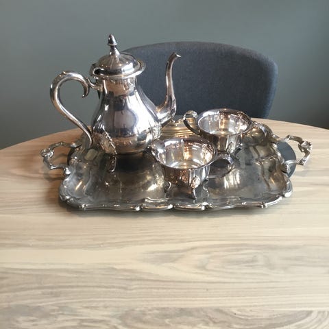 Kaffeservise i metall bestående av tekanne, sukkerskål, melkekanne og brett. Designet for servering av kaffe eller te. Materiale av metall med blank finish.