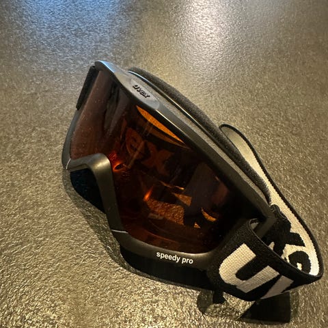 Uvex ski- og snowboardbriller med oransje linse, designet for beskyttelse og forbedret sikt under vintersport. Lange World Cup skihjelm i blå farge, størrelse XS (53-54 cm), laget i Italia med sertifisering fra Ortottica. Hjelmen har polstring for komfort og sikkerhetsfunksjoner for bruk ved skiaktiviteter.