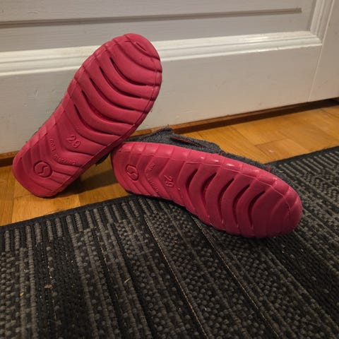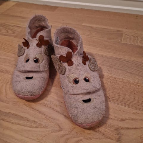 Superfit barnesko unisex i rød farge. Skoene har et lekent design med detaljer som ligner en katt med øyne og nese. De er i ull, så de er gode og varme.
