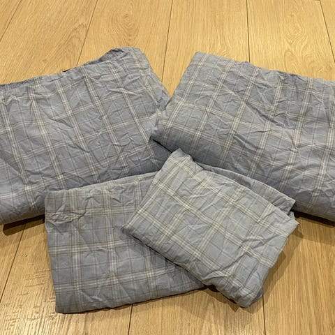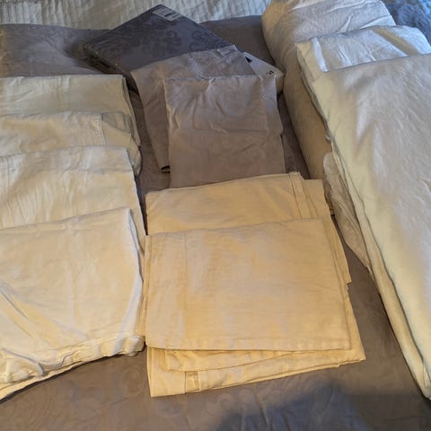 Selger 3 stk sengesett, 2 stk 140x200 cm av hver type. Beige med blått mønster og endfarget rosa er i bomull, mens det beige med røde og grønne blomster er sateng. Ingen flekker/merker.