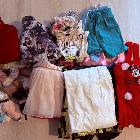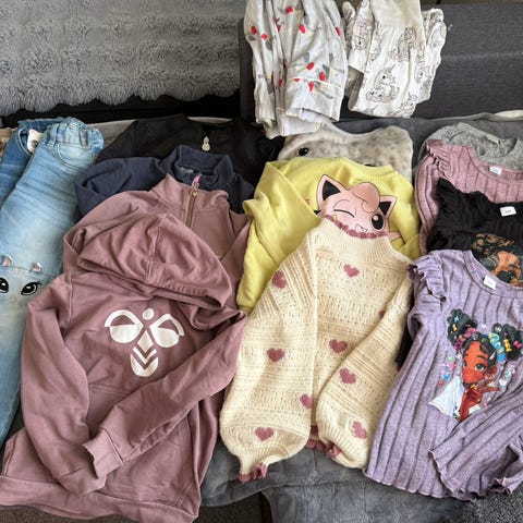 Jeg selger en klespakke i størrelse 110/1106. Klærne er i størrelse 110, 116 og 110/116. Enkelte klær har flekker eller løse tråder.