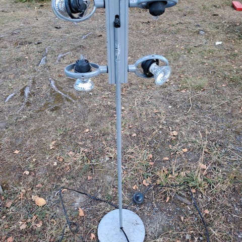Bordlampen er tradisjonell i formen, men støpt i plast. Lyset er diffust og skinnet rødlig.
