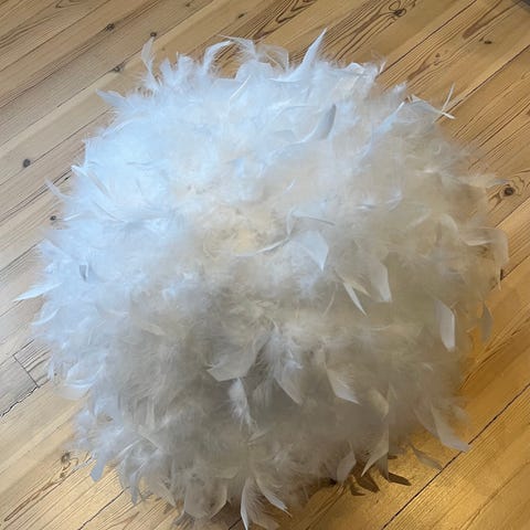 Selger en helt ny og ubrukt fjærlampe med myk, fluffy skjerm som gir et varmt og koselig uttrykk i rommet. Perfekt til stue, soverom eller gang.
