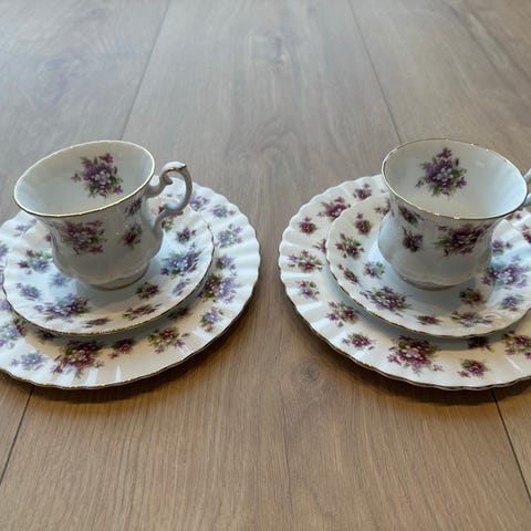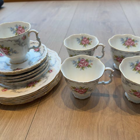 Polka Rose kopp med skål og asjett. Kun håndvasket. Har 5 stk. 500kr per sett.