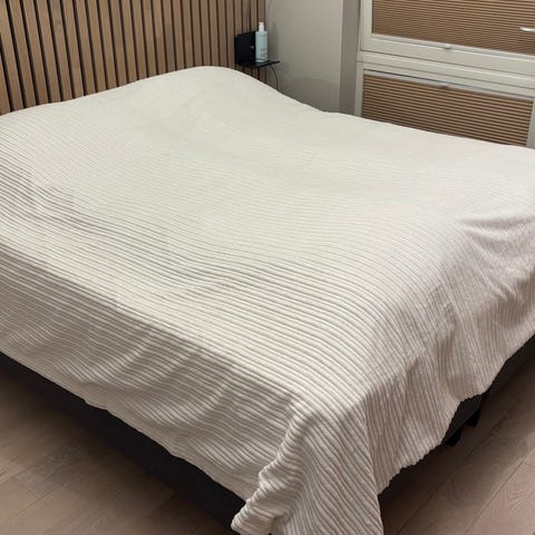 Dobbelt laken i hvit sateng, formsydd til å passe til en regulerbar seng med delt rammemadrass. Kjøpt hos Bedre netter, og brukt en gang, da vi ikke beholdt sengen. Bildene er fra leverandørens side, klare ikke å ta en bilde som gir mening når jeg ikke har en passende madrass å sette det på. Men er altså så godt som nytt.