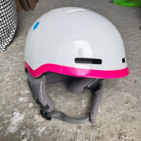 Hjelm i barnestr small/medium selges, til slalåm/snowboard/skøyter. Øreflapper som holder ørene varme.