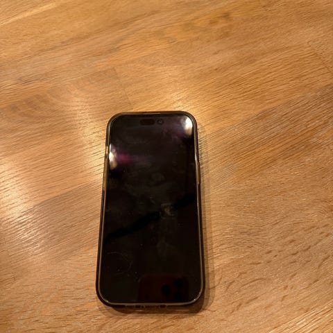 Apple iPhone 14 med 128 GB lagringskapasitet. En smarttelefon med flere kameraer på baksiden, skjerm uten synlige knapper foran, og tilhørende ladekabel i esken. Batterikapasiteten er målt til 86 % av maksimal kapasitet, med funksjon for optimalisert batterilading aktivert.
