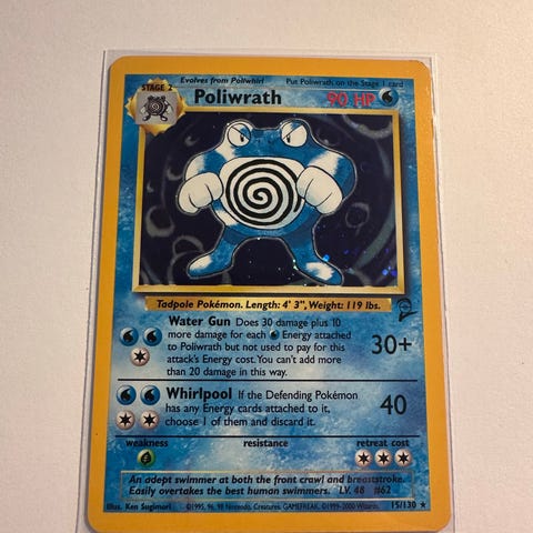 Pokemon Poliwrath Holo kort fra 2000, del av Base Set. Kortet er vurdert som Mint tilstand av PSA og er beskyttet i en plastkapsel.