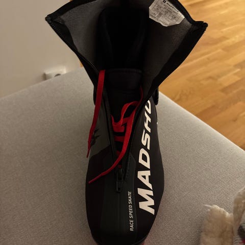 Madshus skisko i størrelse 43. Skiskoene er svarte med røde detaljer og laget for å gi støtte og komfort under skigåing.