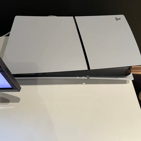 Sony Playstation 5 spillkonsoll med hvit og svart design. Konsollen har en moderne utforming og er beregnet for hjemmeunderholdning og videospill.