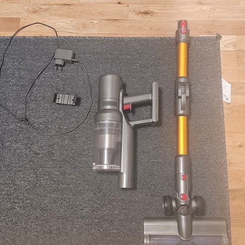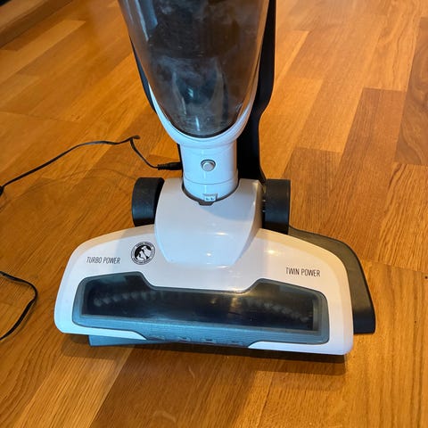Leveres med lader, ekstra filterpute, forlengbar stang, smal munnstykke og gardinbørste. Selges fordi den store gulvbørsten er skadet, men maskinen er fortsatt i veldig god stand og veldig praktisk for rengjøring av kroker og kriker.