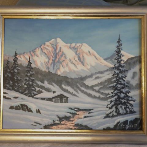 Oljemaleri 1993, selvmalt, motiv Matterhorn Sveits. Ramme 33x42 cm. Sender ikke, Kr 500,-