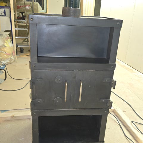 Vedovn i sort metall med glassdør. Har noen rustmerker, men dette kan muligens fjernes (?). Selges fordi vi har kjøpt ny.