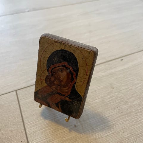 Ikon av jomfru Maria malt på en treplate med gull- og blåtoner. Platen har en krok for oppheng og viser tradisjonell religiøs kunst. Passer til dekorasjon eller samling.