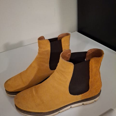 Skolettene er i nubuck/lær og med varmt for. Hælene er sålet om for en mer dempet gulvlyd. Lite brukt.