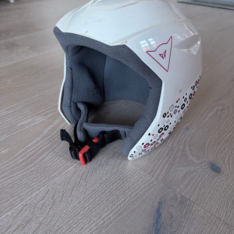 Dainese hjelm i størrelse M (54), farge hvit med blomsterdesign. Hjelmen har polstret innside og justerbar hakestropp for sikker passform.
