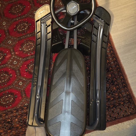 Stiga Curved Pro, defekt kassett til tau, samt sprekk i fram ski. Kan brukes, evt kan nytt kjøpes på Clas Olson. Selges kr 200.